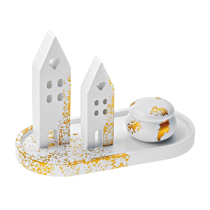 Ενα μοναδικο γιορτινο σετ αποτελούμενο απο 4 τεμαχια κεραμικά .Μια μπιζουτίερα κεραμική ,δύο κεραμικά σπιτάκια και δίσκος κεραμικός με τεχνοτροπία στη βαφή .