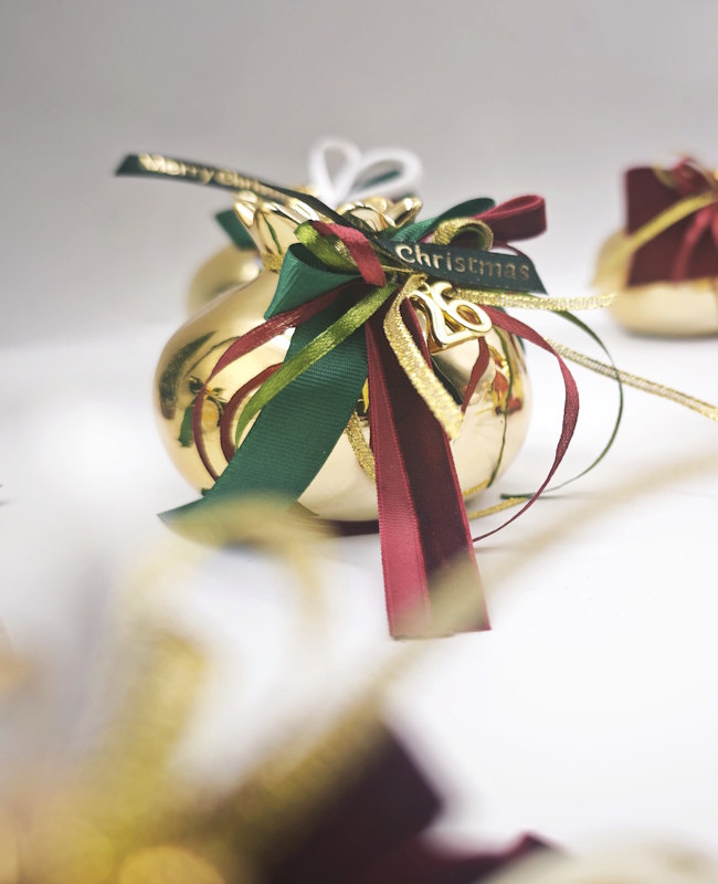 Ο συνδυασμός κορδελών σε μπορντό, πράσινο, λευκό και χρυσό προσφέρει ζεστή χριστουγεννιάτικη αισθητική, ενώ το μεταλλικό στοιχείο χρονιας το κάνει ιδανικό ως γούρι για τη νέα χρονιά.