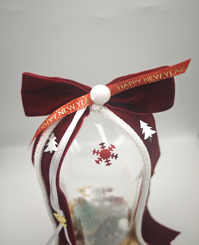 Ο θόλος στολίζεται με μεγάλο βελούδινο φιόγκο σε βαθύ μπορντό και πλούσιες κορδέλες, ενώ διαθέτει και μεταλλικό στοιχείο χρονιάς, κάνοντάς το ιδανικό ως γούρι ή ως δώρο.