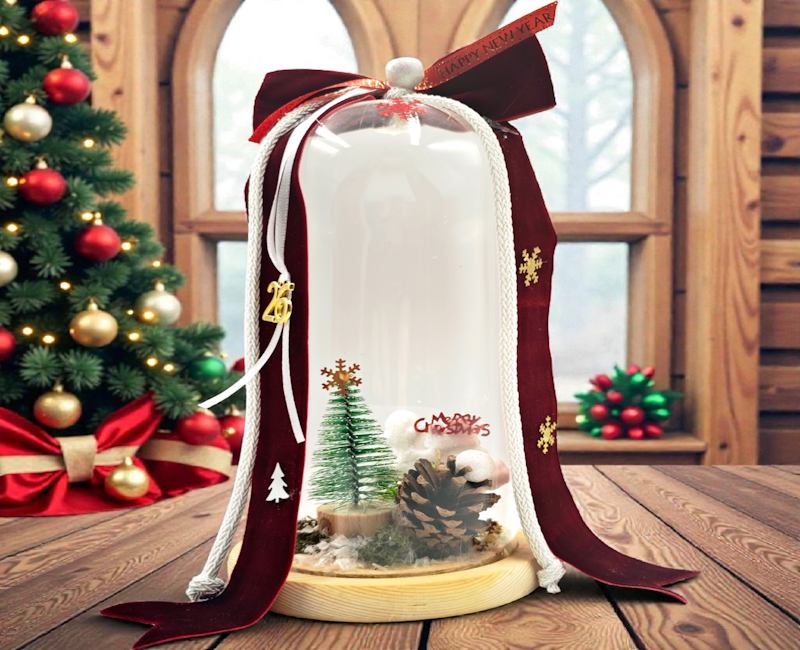 Ένα κομψό και ατμοσφαιρικό χριστουγεννιάτικο διακοσμητικό σε γυάλινο θόλο, ιδανικό για να χαρίσει ζεστασιά και μαγεία σε κάθε χώρο.