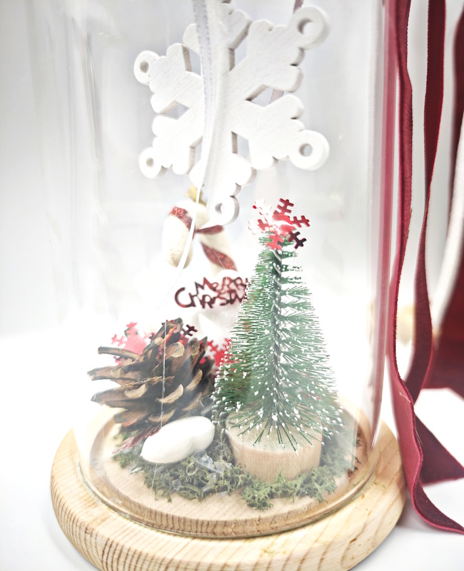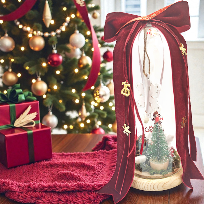 Μια εντυπωσιακή γυάλα με ξύλινη βάση, διακοσμημένη με χειροποίητες λεπτομέρειες που δημιουργούν ένα μικρό, μαγικό χριστουγεννιάτικο σκηνικό.